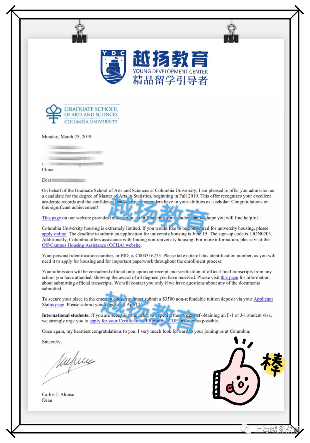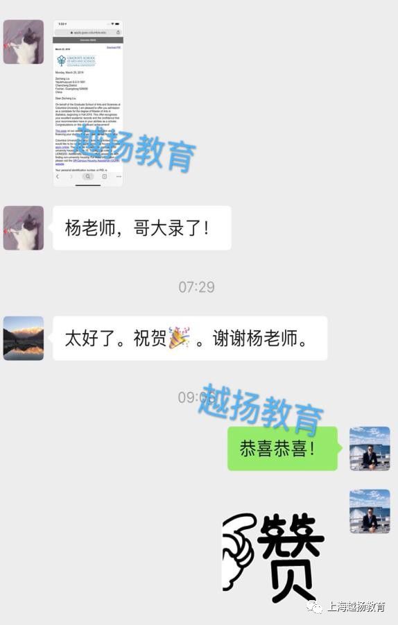 终于,到了 3 月 26 日,小伙更是人品爆发,获得了全美 TOP3 哥伦比亚大学的统计学 Offer,这下完美了。尽管 GRE 不如意,尽管本科学校一般,但是我们越扬还是帮他完成了滕校梦。看着孩子和家长对我们的感激,我的心里无比的温暖。这也正是我们作为一个国际教育升学规划师应有的责任和欢喜。