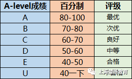 A-Level的考试成绩分为六个等级,即A、B、C、D、E、U。A为最优,E为合格,U为不合格,与百分制换算关系如下: